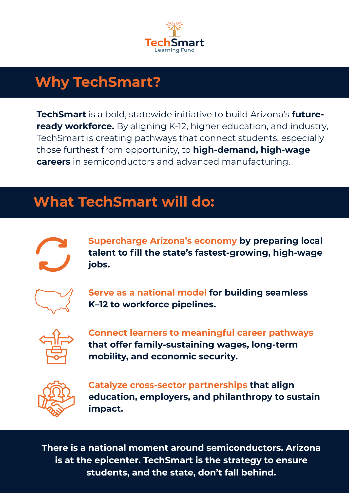 Arizona is a focal point for this technological renaissance and has attracted over $200 billion in investments, becoming a national hub for semiconductor manufacturing and innovation. The state offers an ideal model for building scalable talent pipelines by aligning workforce development with industry needs. Through semiconductor education programs, targeted technical training, apprenticeships, and industry-driven partnerships, TechSmart Learning Fund will boost Arizona’s high-tech workforce, supporting local economic growth and contributing to national workforce efforts.
